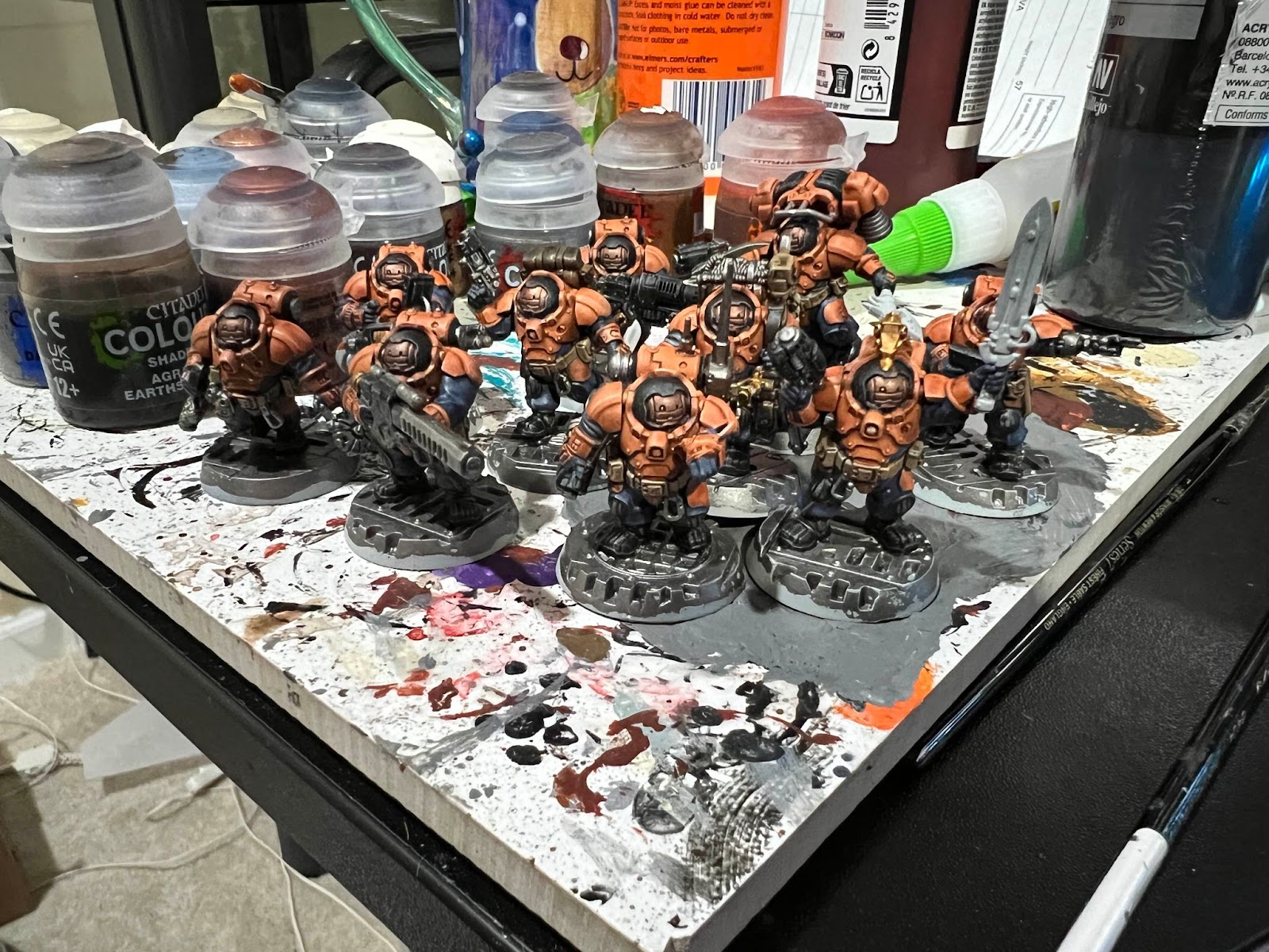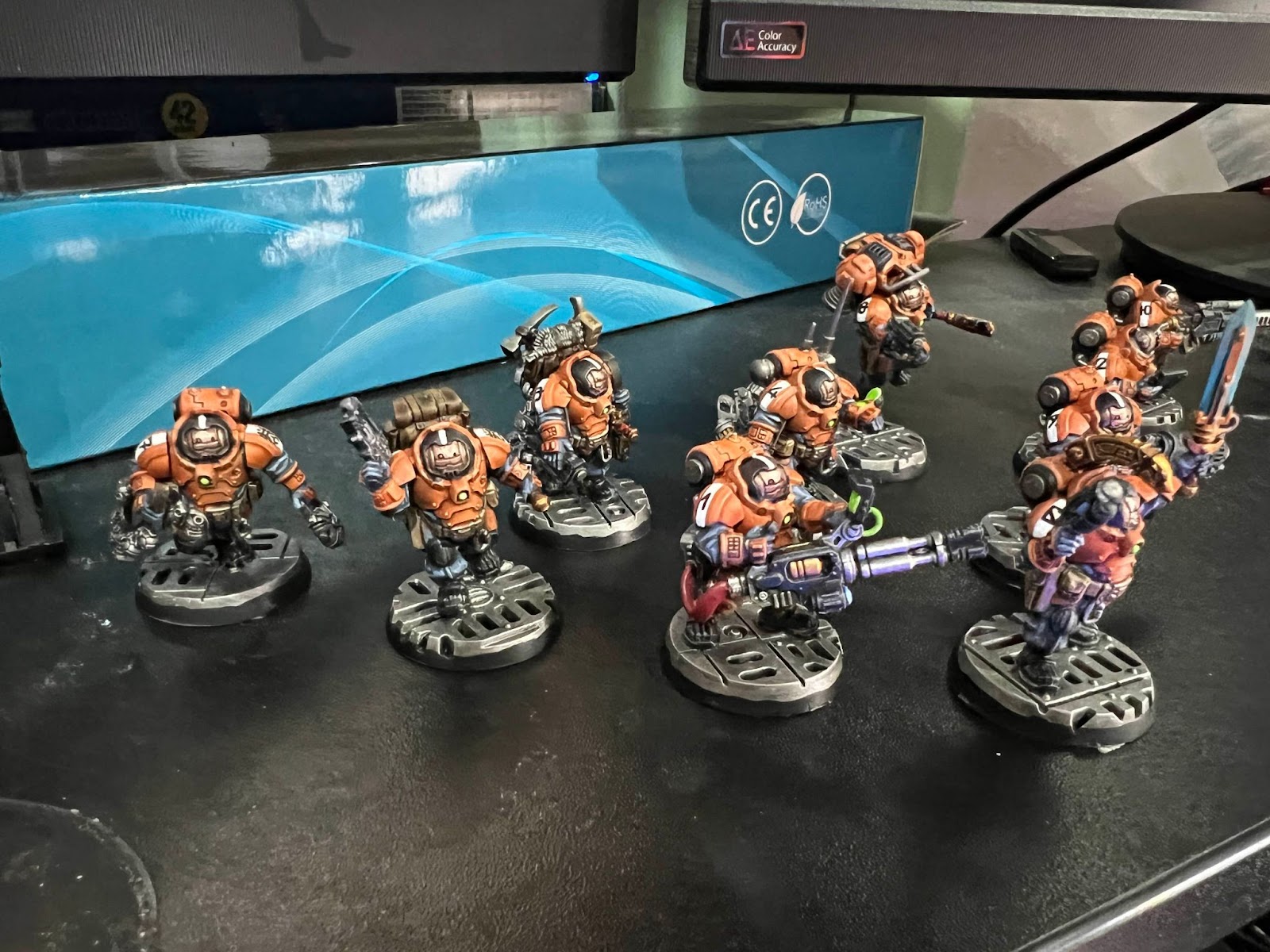 At the same time as I painted the manor, I tried taking care of the Hearthkyn Kill Team. I was hoping to make the armor a lot brighter of a metallic, almost like a candy metal orange. I didn’t quite achieve that effect, namely because the orange contrast on metal was not nearly as light and “candy” as I was hoping. I ended up revisiting these guys and using a tutorial from YouTube here for Trans-Hyperian League.